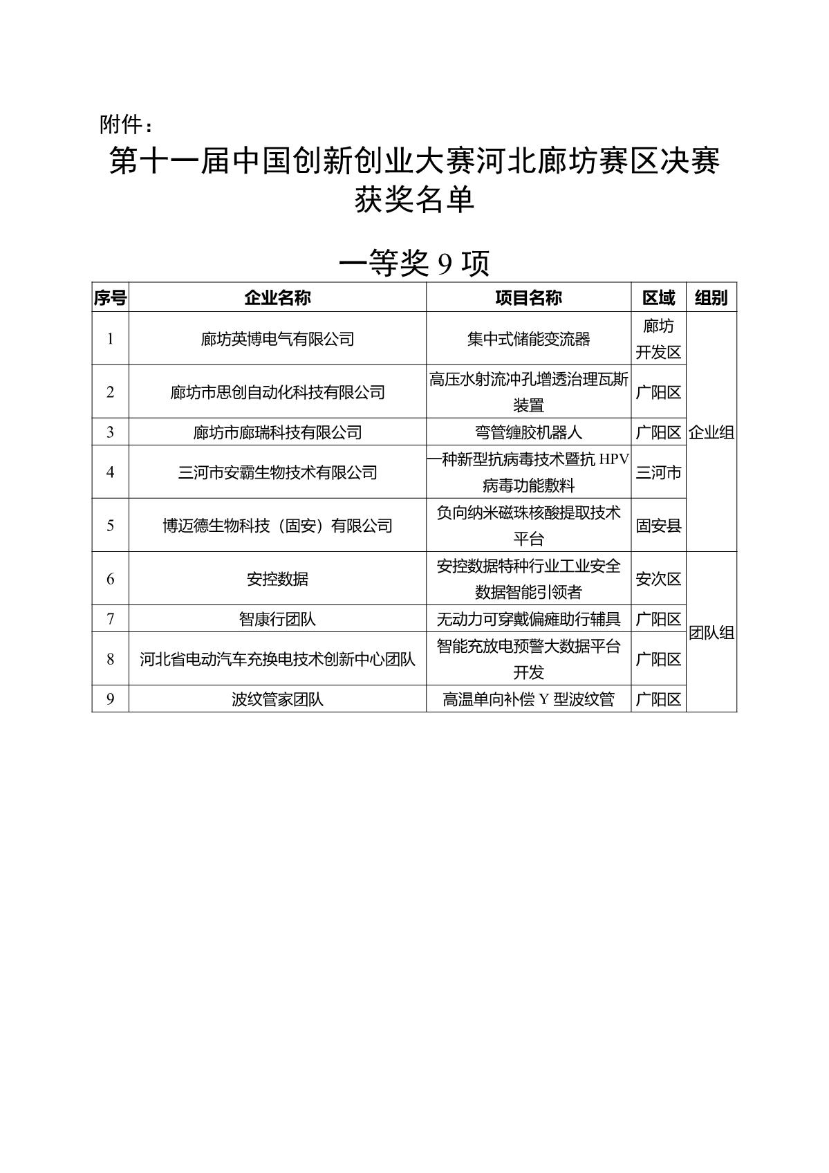 關(guān)于對(duì)第十一屆中國(guó)創(chuàng)新創(chuàng)業(yè)大賽河北廊坊賽區(qū)決賽獲獎(jiǎng)名